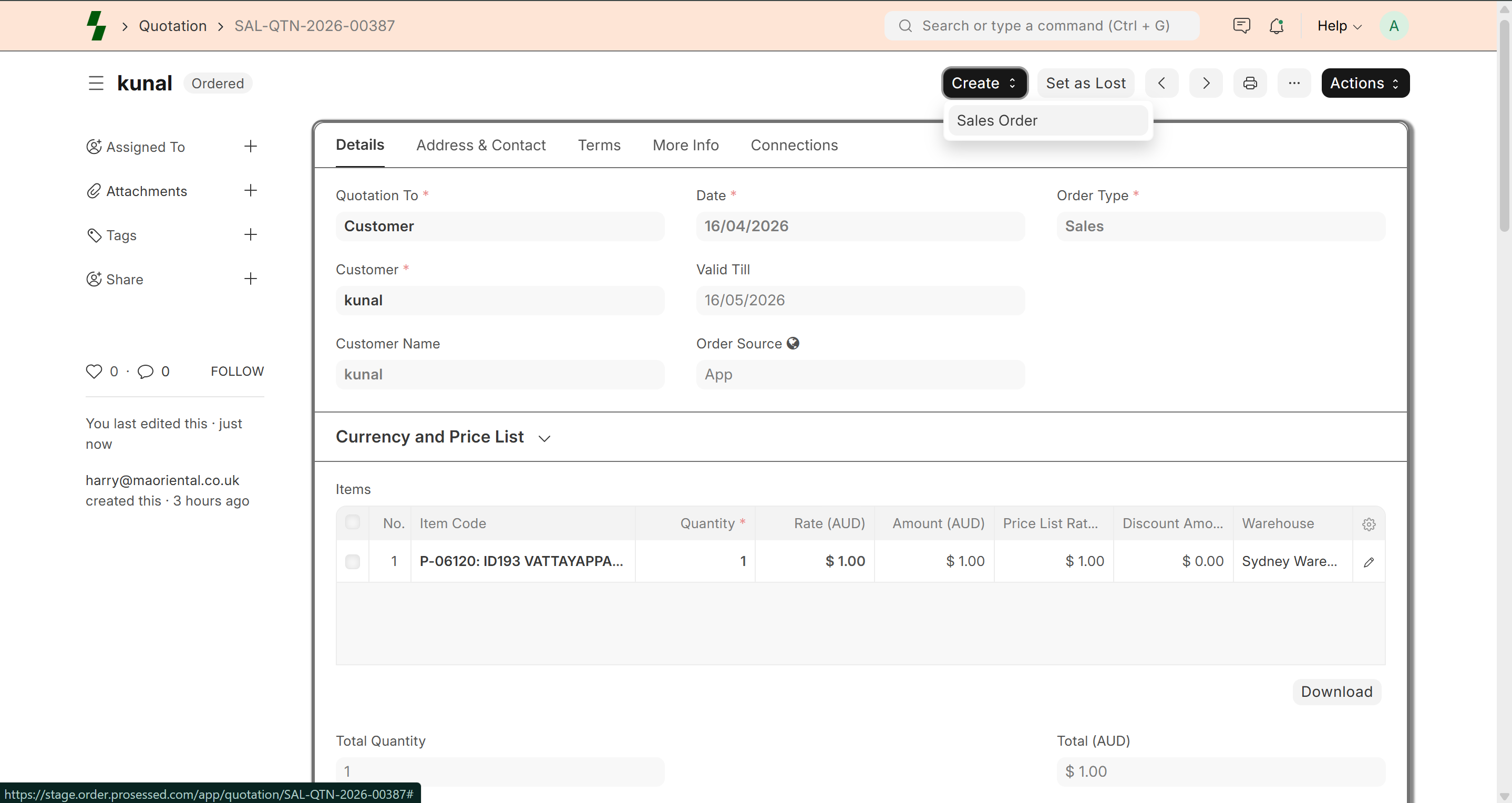 Confirm customer orders and initiate the sales process in Prosessed AI.